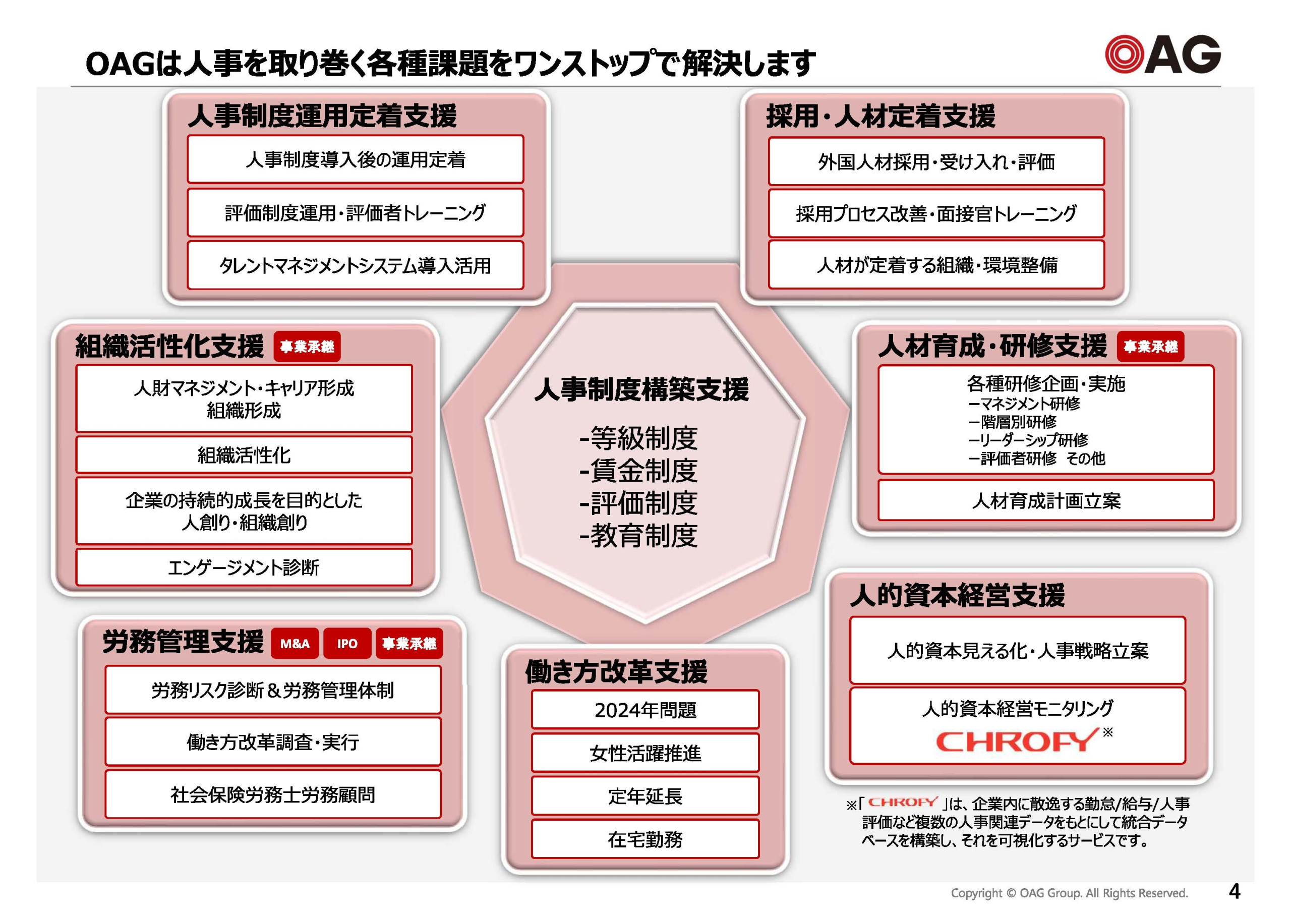 OAGは、中堅・中小規模の企業や組織に特化した人事コンサルティングサービスを提供しています。経験豊富なコンサルタントが、クライアントのニーズに合わせたきめ細やかなサポートを実施。パッケージ化されたものではなく、柔軟な人事制度設計を特徴としています。