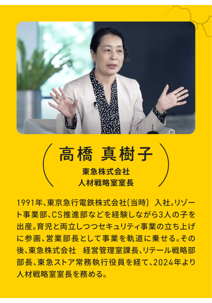 1991年、 東京急行電鉄株式会社(当時) 入社。 リゾー ト事業部、 CS推進部などを経験しながら3人の子を 出産。育児と両立しつつセキュリティ事業の立ち上げ に参画、営業部長として事業を軌道に乗せる。その 後、東急株式会社 経営管理室課長、 リテール戦略部 部長、東急ストア常務執行役員を経て、 2024年より 人材戦略室室長を務める。