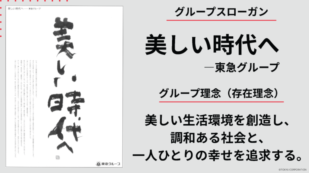 東急グループのスローガン「美しい時代へ」、グループ理念「美しい生活環境を創造し、調和ある社会と一人ひとりの幸せを追求する」は1997年に制定されました。それから30年近く経っていますが、理念が社員に十分浸透していない課題がありました。