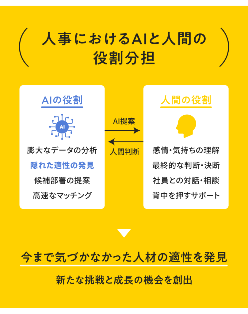 人事担当者が2万人もの社員一人ひとりと対話するのは物理的に不可能ですし、かつてのようにミドルマネジメントが飲みに連れて行って悩みを聞くような時代でもありません。そこで、AIに情報の補完を任せ、感情に関わる部分や最終的な決断は人間が担うという役割分担が理想的だと考えています。